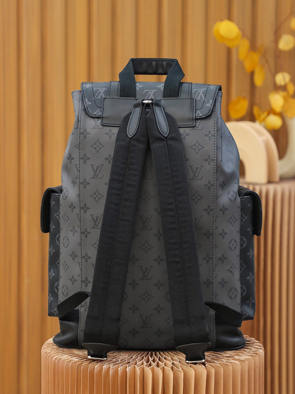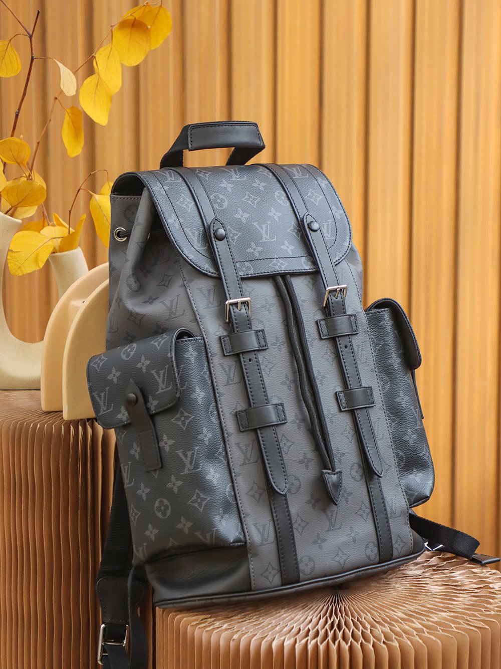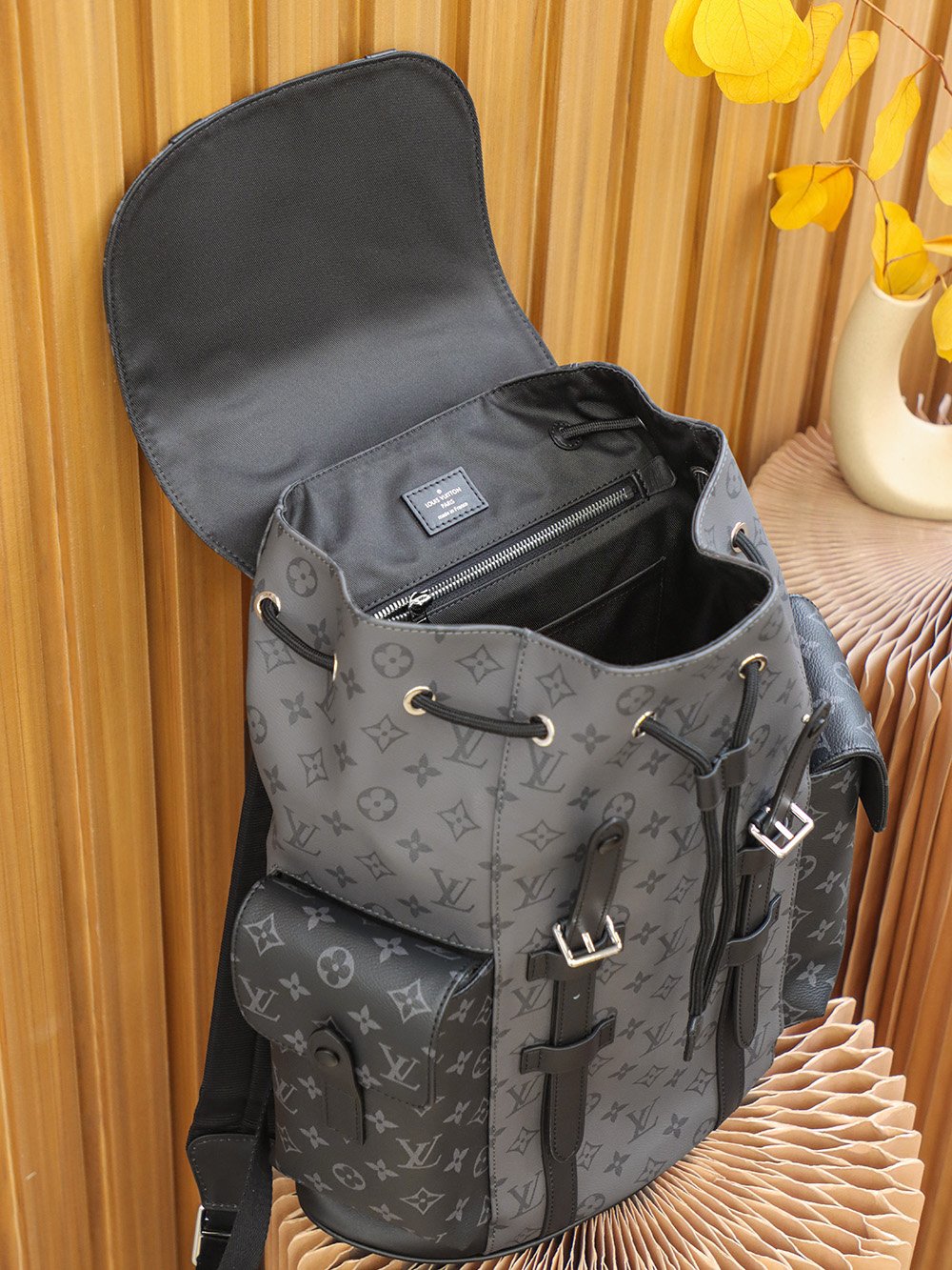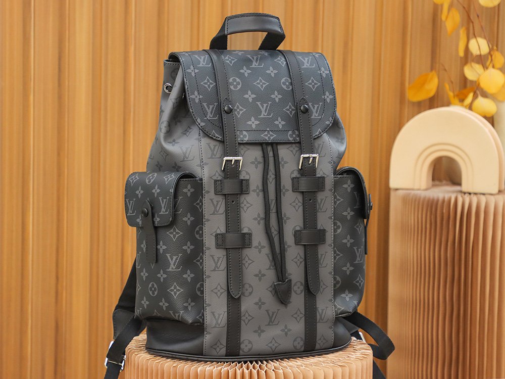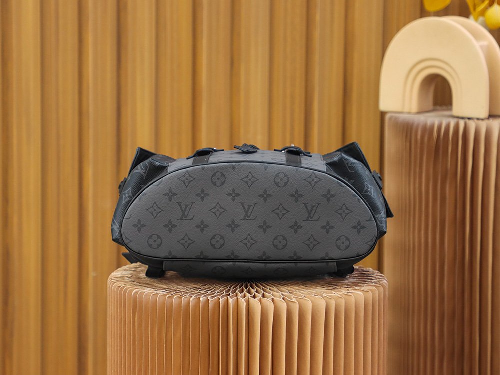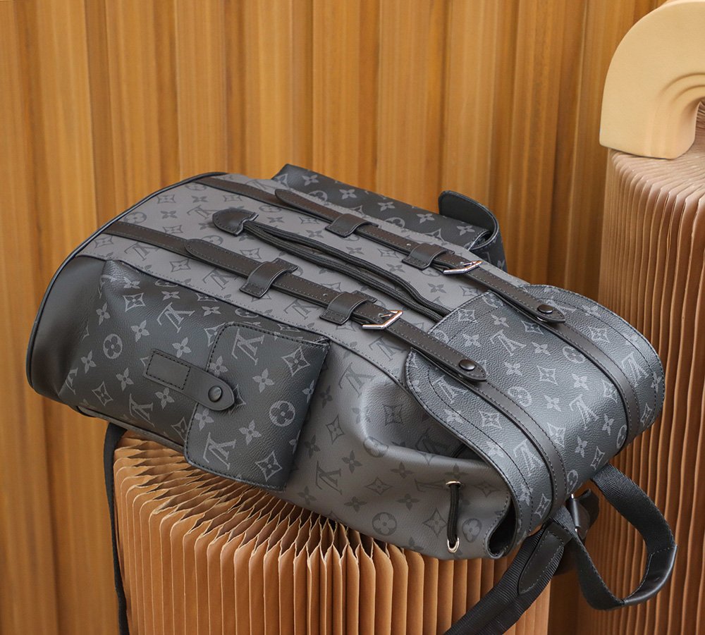 M45419 Gray Floral The Christopher Small Backpack is crafted from the bold Monogram Eclipse canvas and Monogram Eclipse Reverse canvas, accented with black leather trim, reinterpreting the spirit of a hiking backpack. The gray and black color scheme is complemented by silver snap fasteners and zippers. It features multiple pockets and a leather flap with a snap fastener to keep the contents secure.