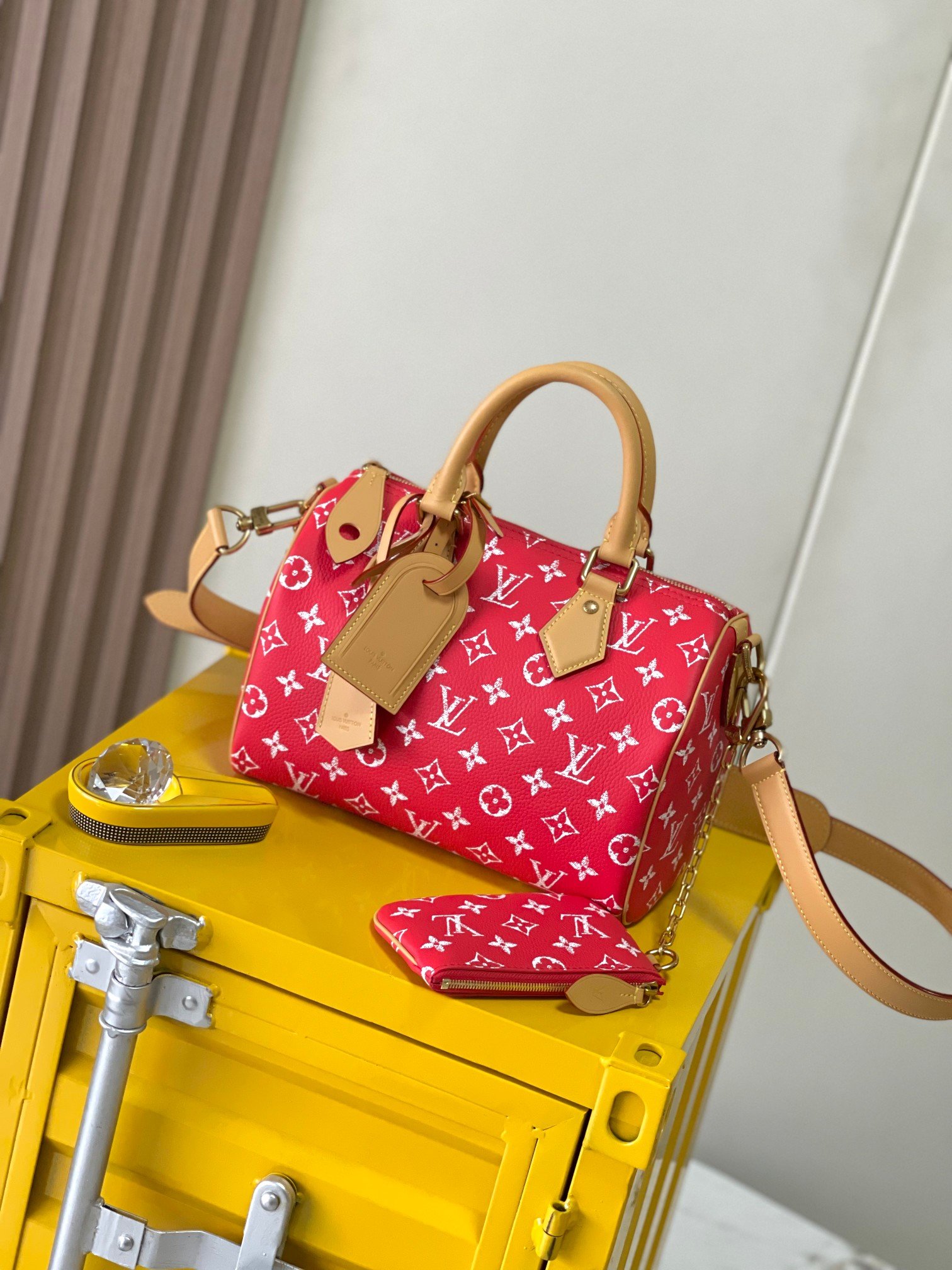 M24425 Red This Speedy P9 Bandoulière 25 Monogram leather handbag exudes a luxurious feel thanks to its supple calfskin leather. Polished metal hardware, a lambskin lining, and an internal label highlight Creative Director Pharrell Williams’s attention to detail. Dimensions: 25 × 15 × 15 cm