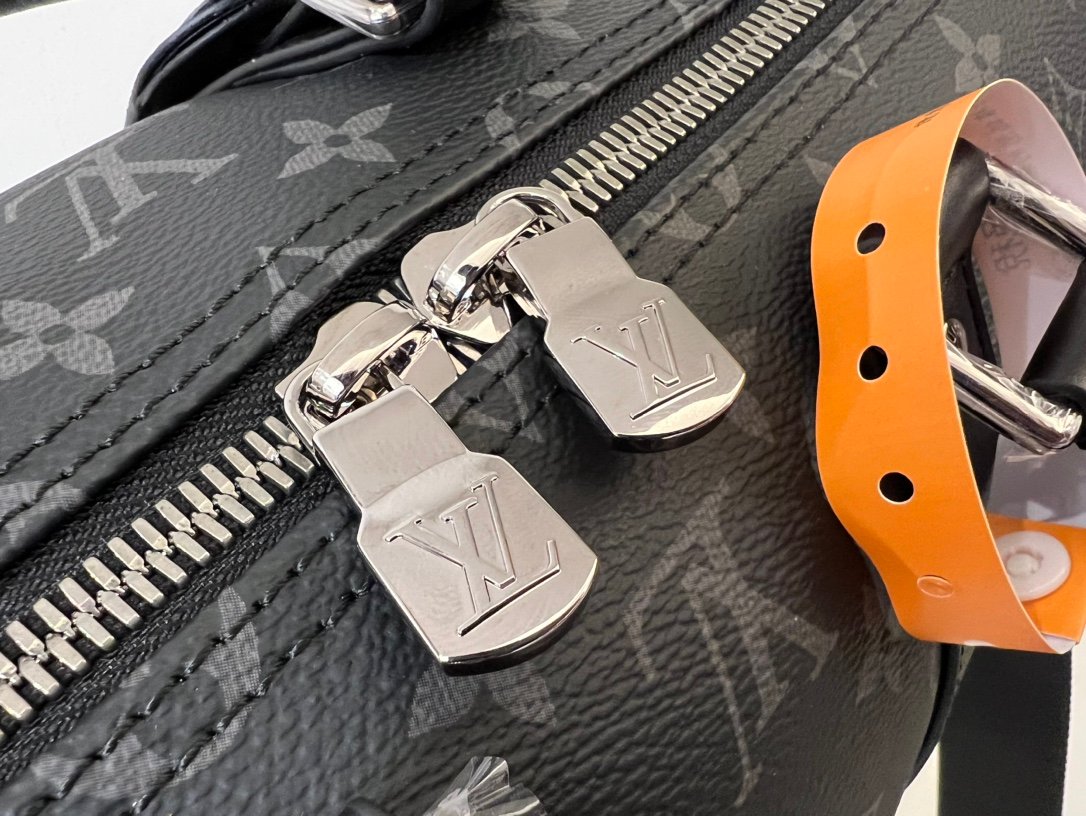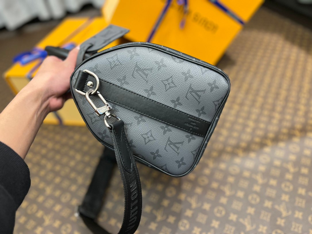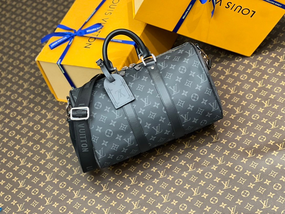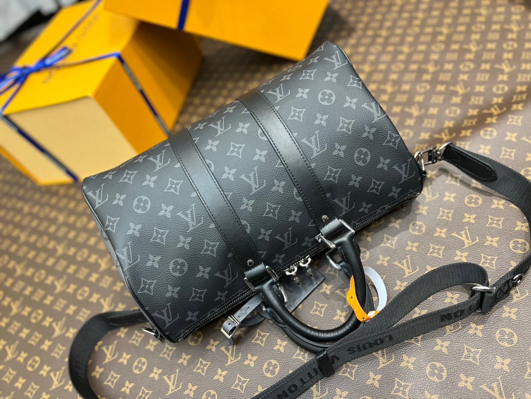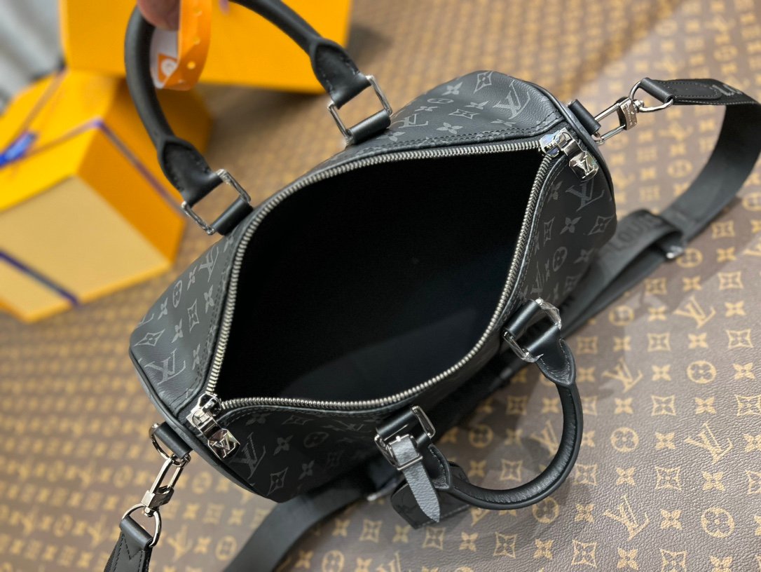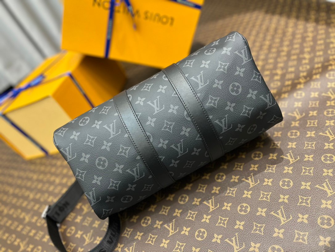M46655 Black Floral Keepall 35 Travel Bag, crafted from the new iconic Monogram Eclipse canvas. Since 1930, the Keepall collection has accompanied generations of travelers on their journeys around the world. This updated travel bag features multiple comfortable leather handles, a strap for casual crossbody wear, and a shiny padlock, making it the perfect companion for short trips. The side straps and top rolled leather handles pay homage to the classic Keepall design, while the removable and adjustable fabric shoulder strap allows for comfortable carrying over the shoulder or crossbody. It offers slightly more capacity than the City Keepall bag. Size: 35 x 21 x 6 cm.
