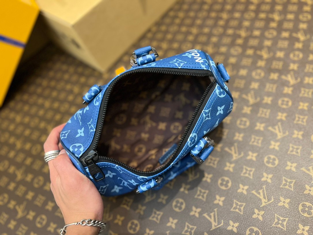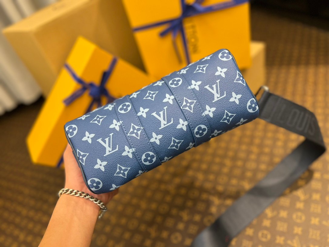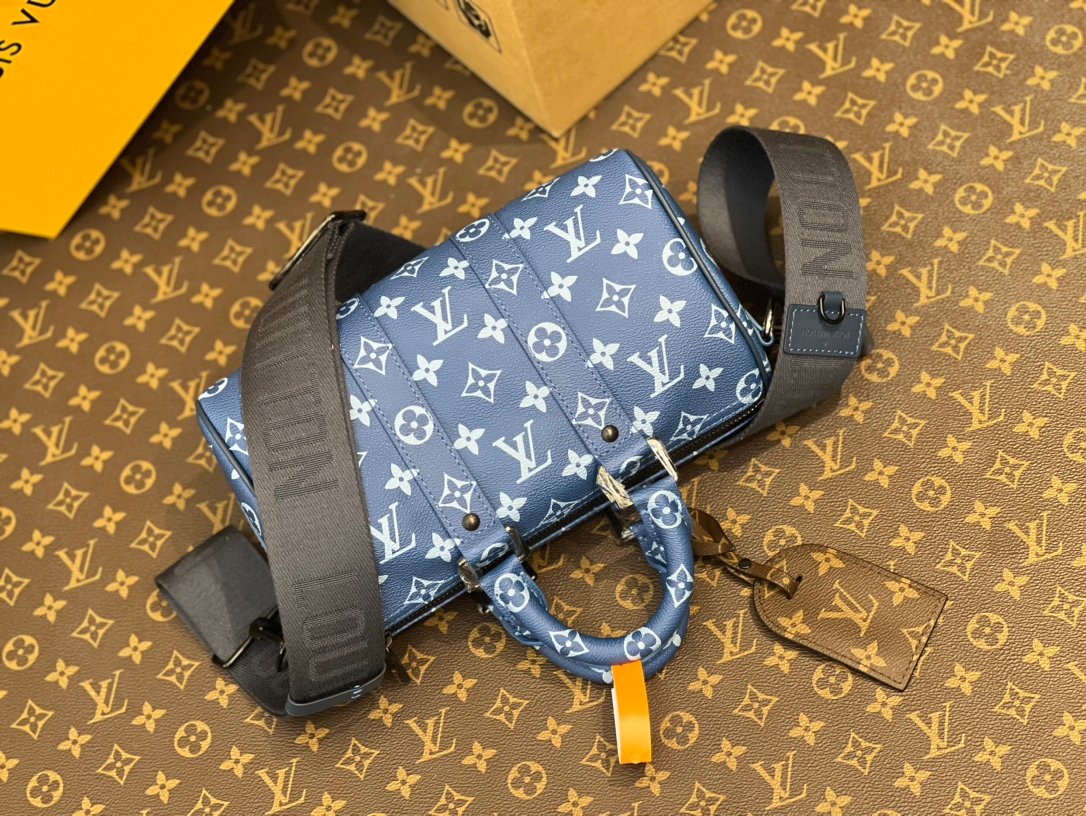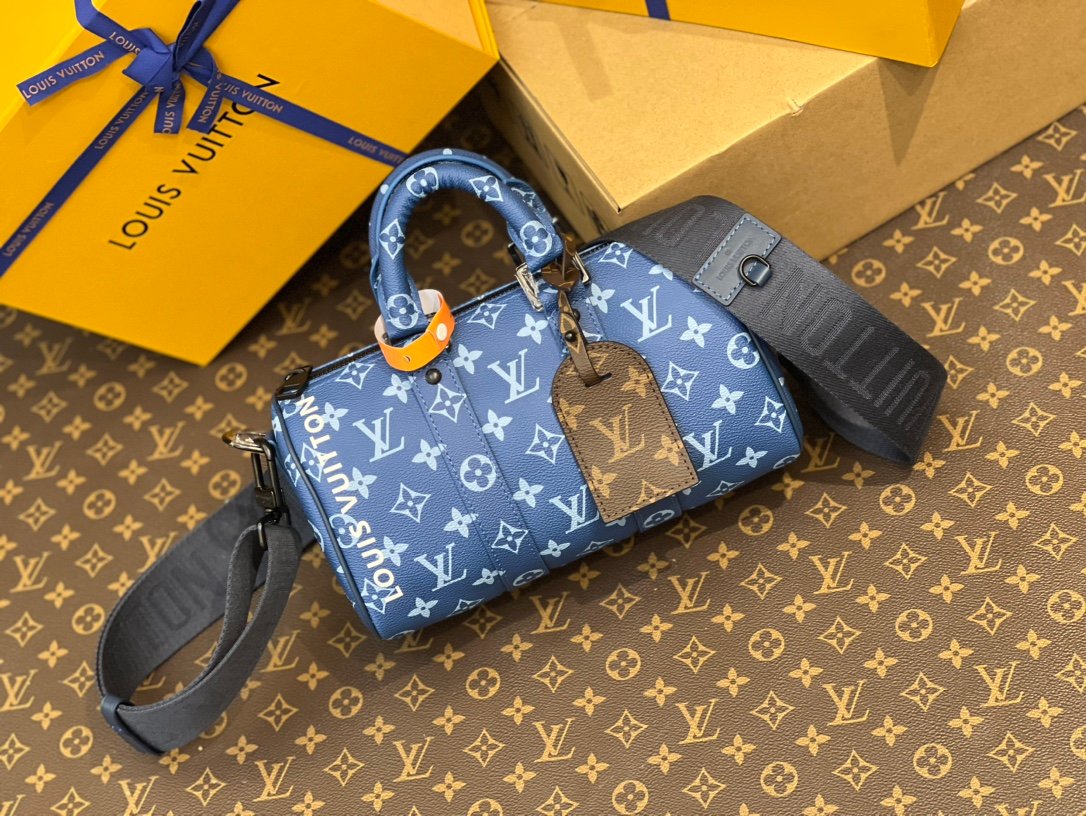 M46803 Blue Floral Men’s Keepall Bandoulière 25 Bag This Axy Keepall Bandoulière 25 city bag is crafted from coated canvas and is a mini version of Louis Vuitton’s iconic Keepall travel bag. The bag’s details echo the original design, including a leather top handle and side straps, and features a detachable, adjustable wide shoulder strap for carrying over the shoulder or across the body. Dimensions: 25 x 15 x 11 cm (L x H x W)