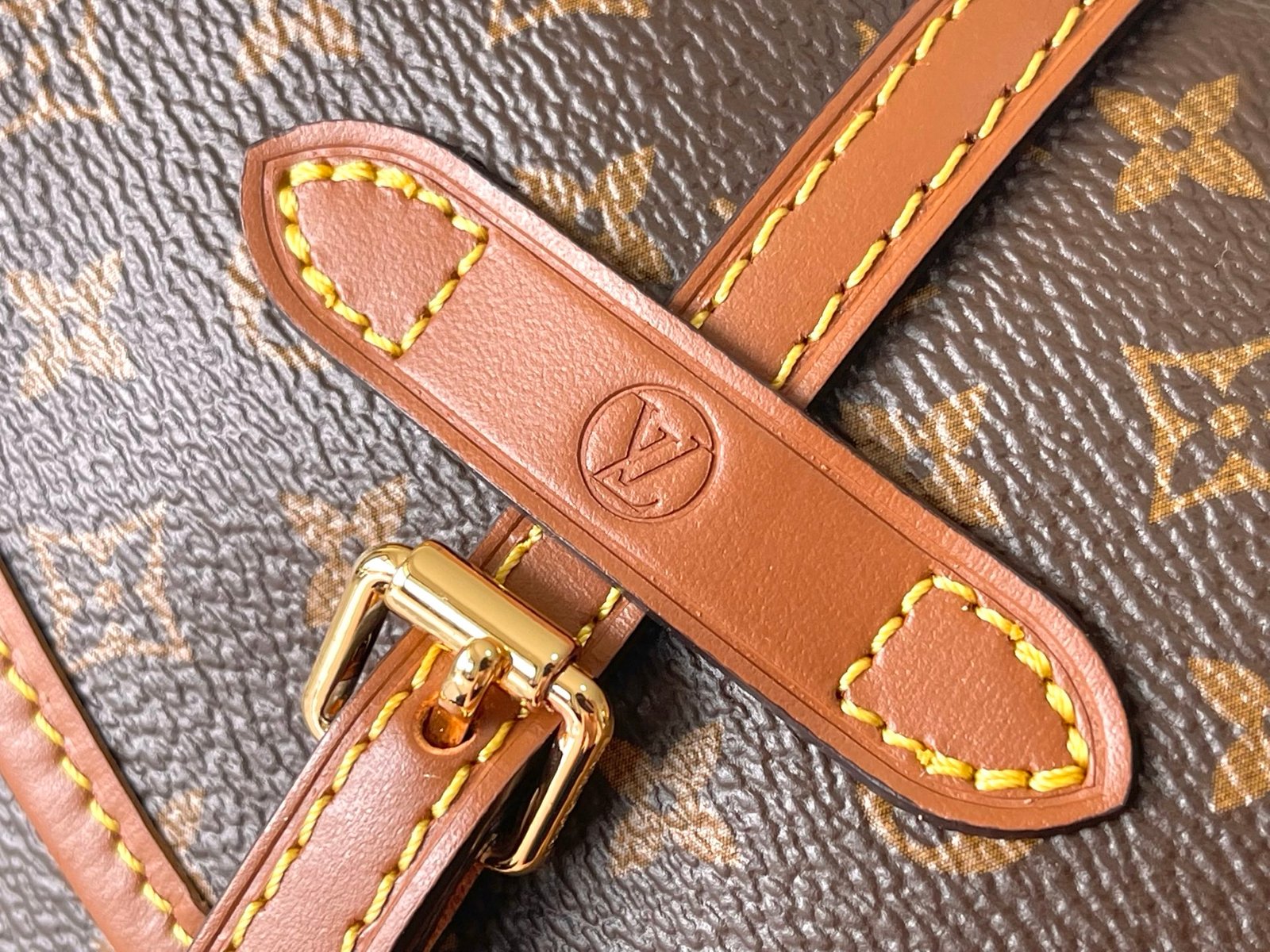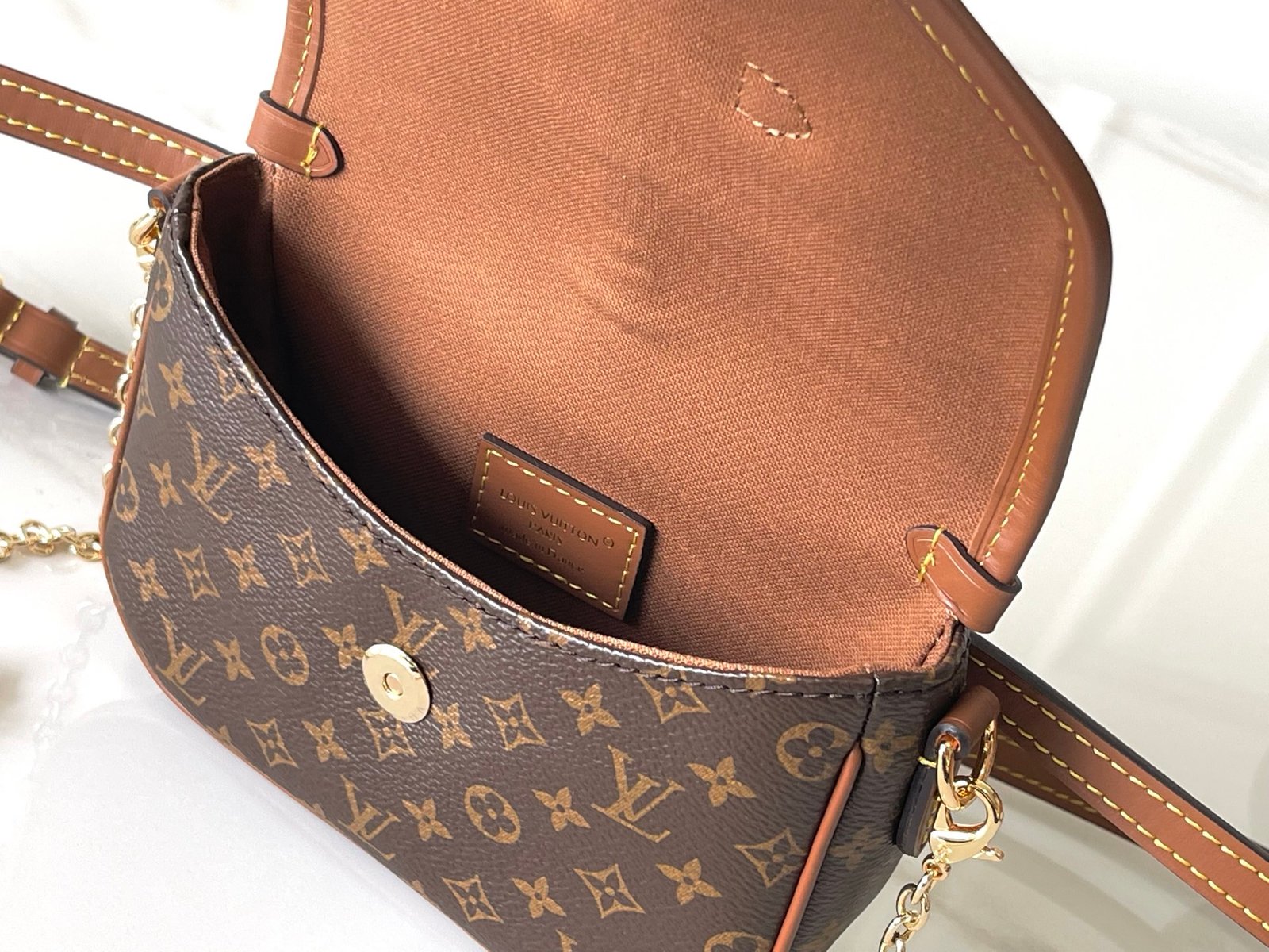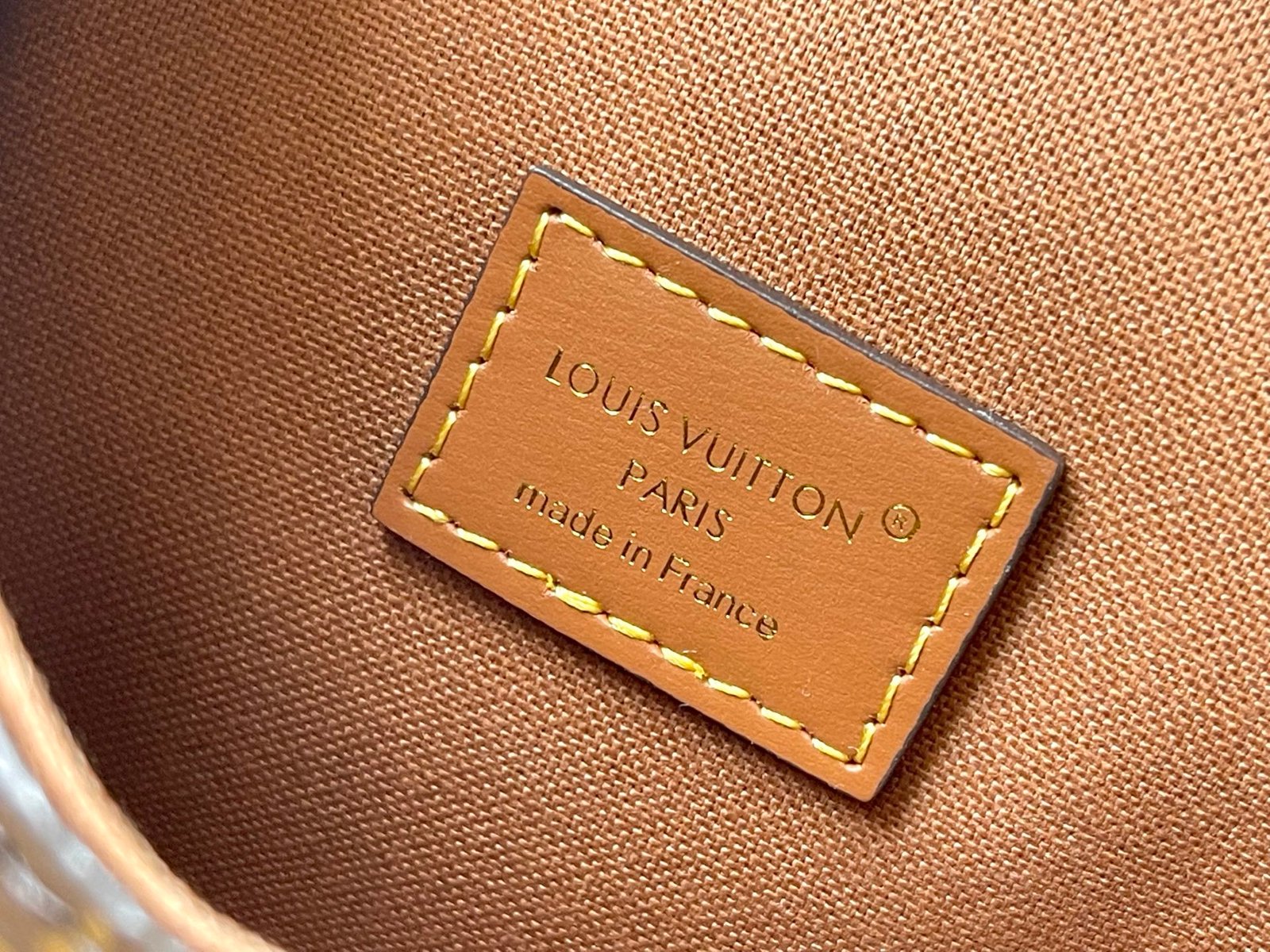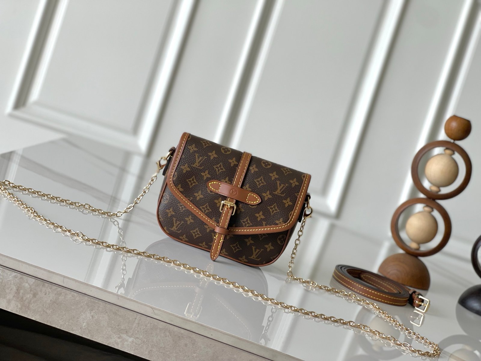 M27096 This Solo handbag combines Monogram canvas and smooth calf leather, featuring a contrasting lining and a detachable metal chain, making it a stylish accessory choice. Its compact size easily holds keys and loose change. The detachable wide shoulder strap allows for comfortable carrying on the shoulder, crossbody, or around the waist.