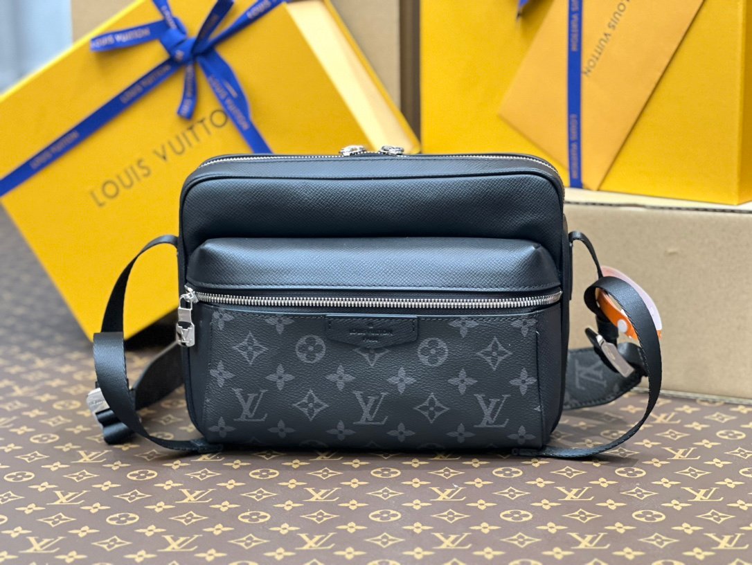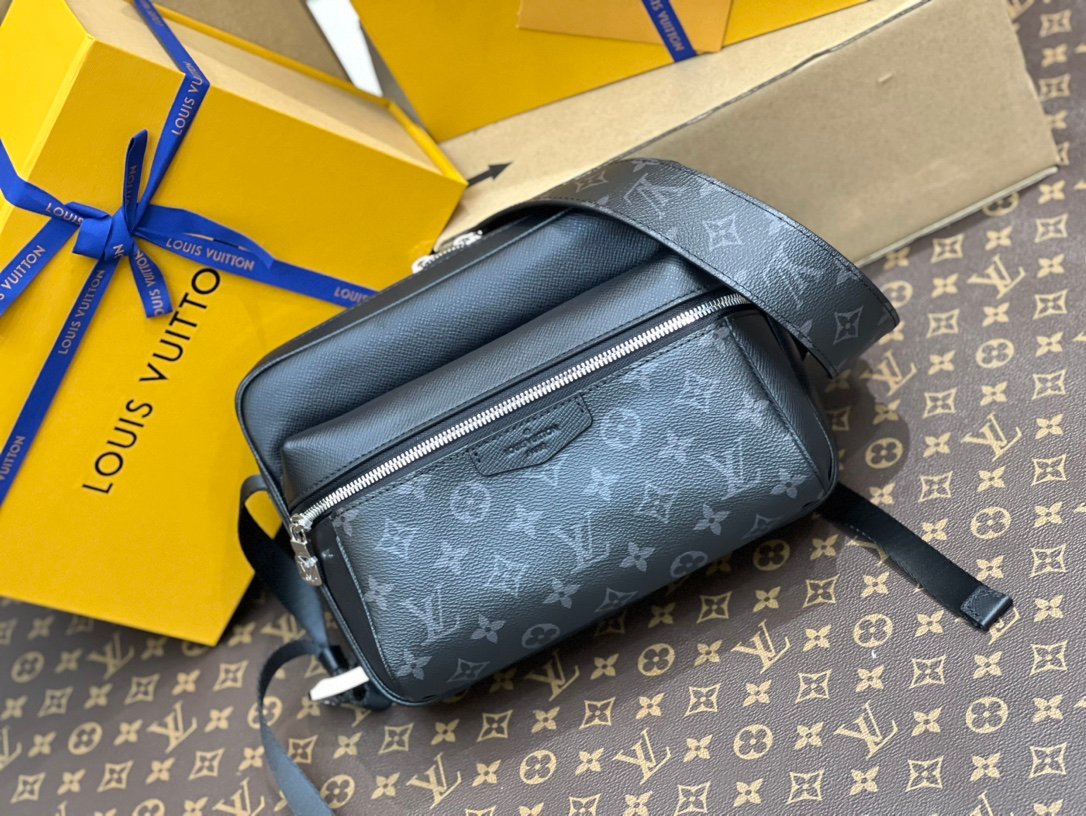 M30233 Black Floral Messenger Bag Series OUTDOOR Messenger Bag Louis Vuitton welcomes the Spring/Summer 2019 season with a blend of Taïga leather and Monogram canvas, adding a harmonious touch to the bold design of the Outdoor Messenger Bag. The silver zipper and metal hardware on the front feature exquisite detailing, while the adjustable shoulder strap ensures a comfortable carrying experience. 29.5 x 20.0 x 10.5 cm