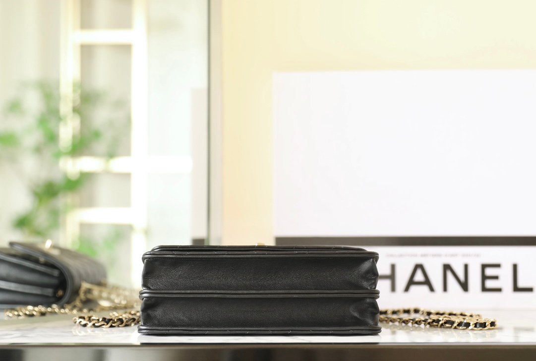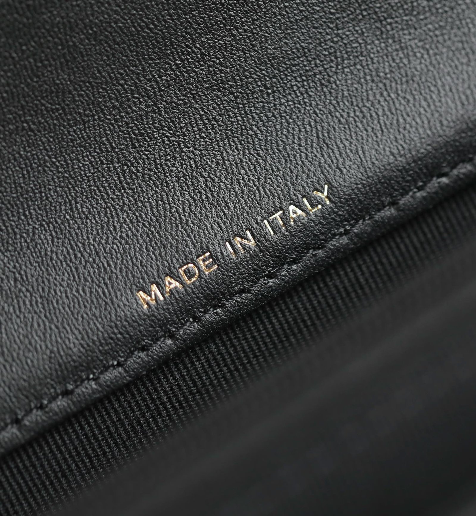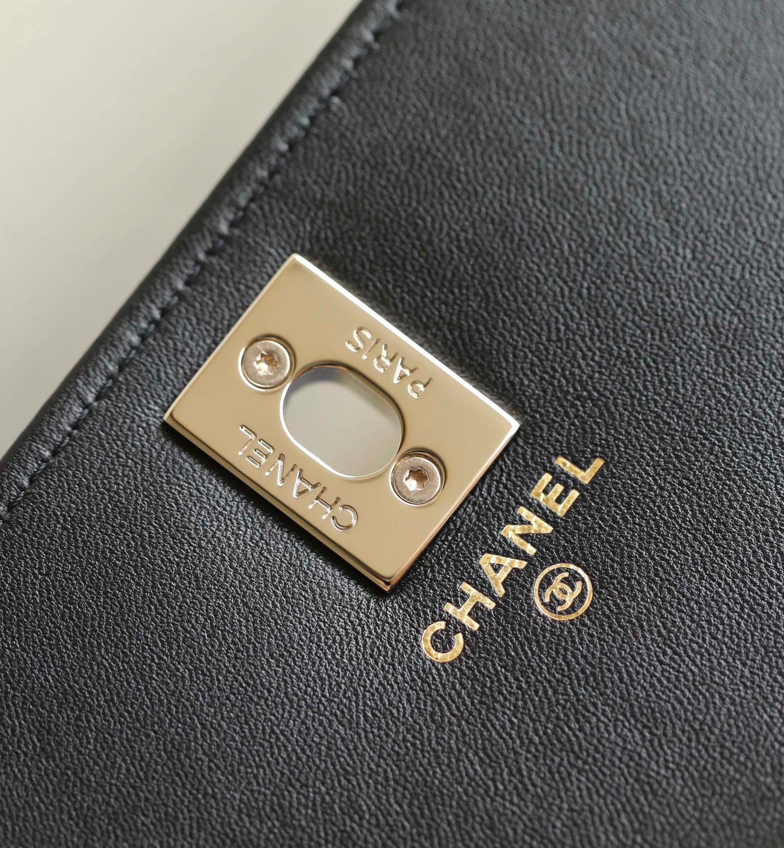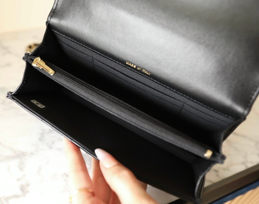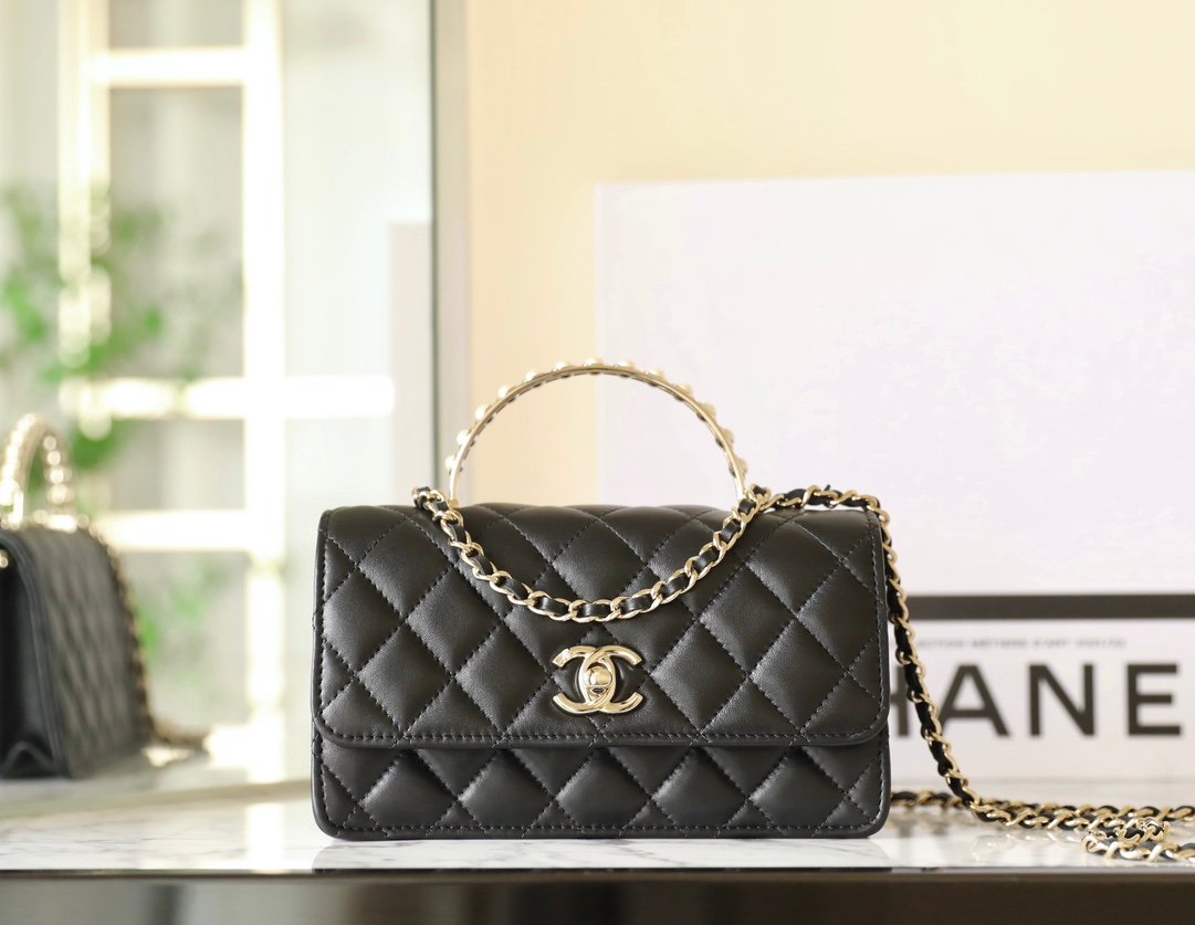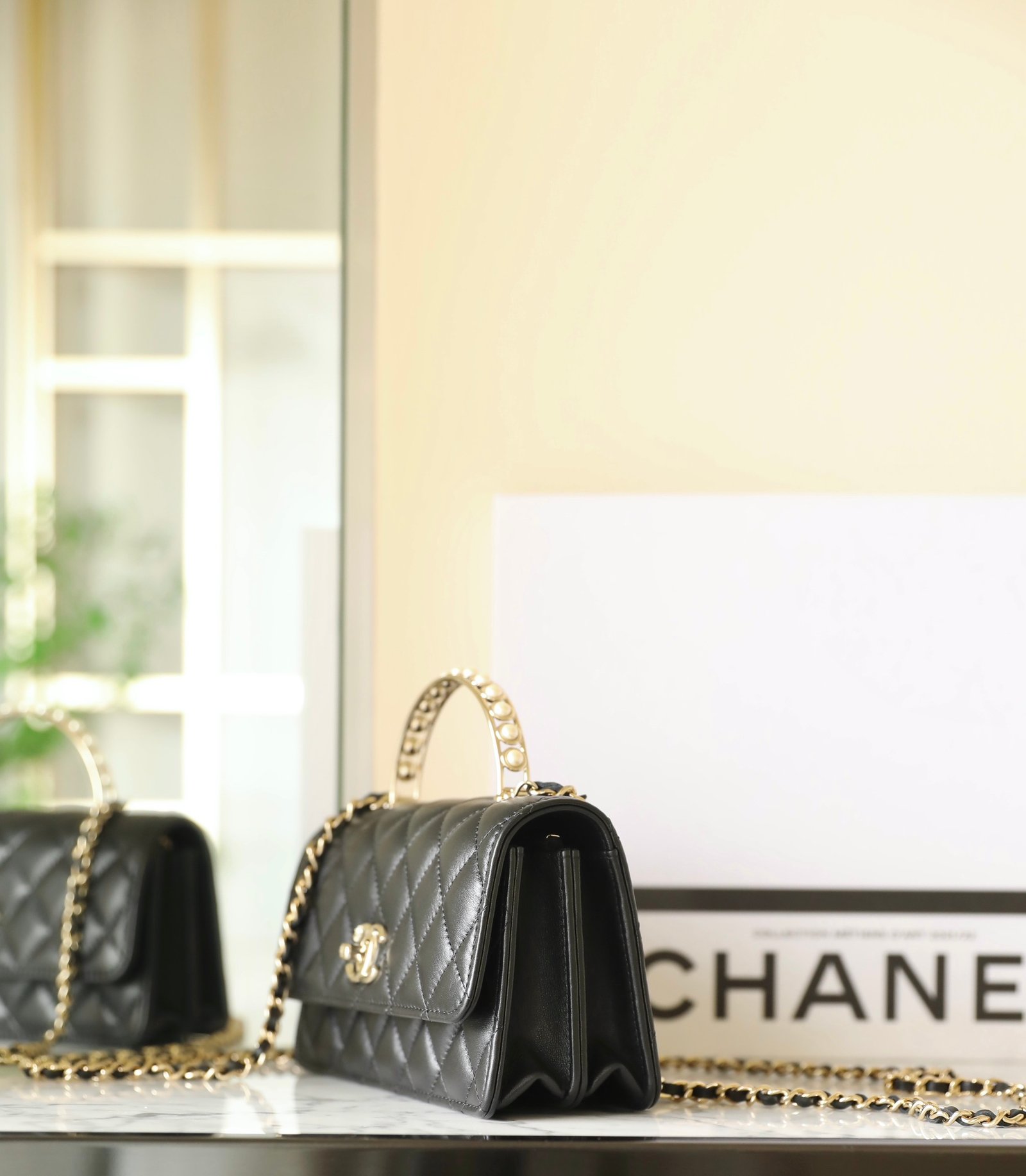 Pearl-embellished wrist strap paired with genuine lambskin,