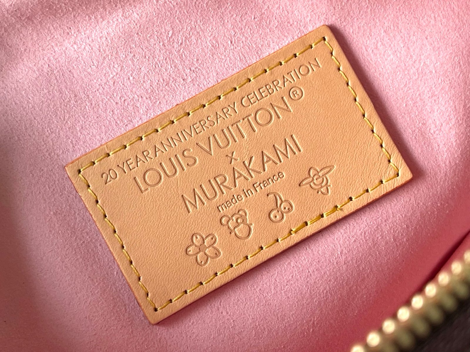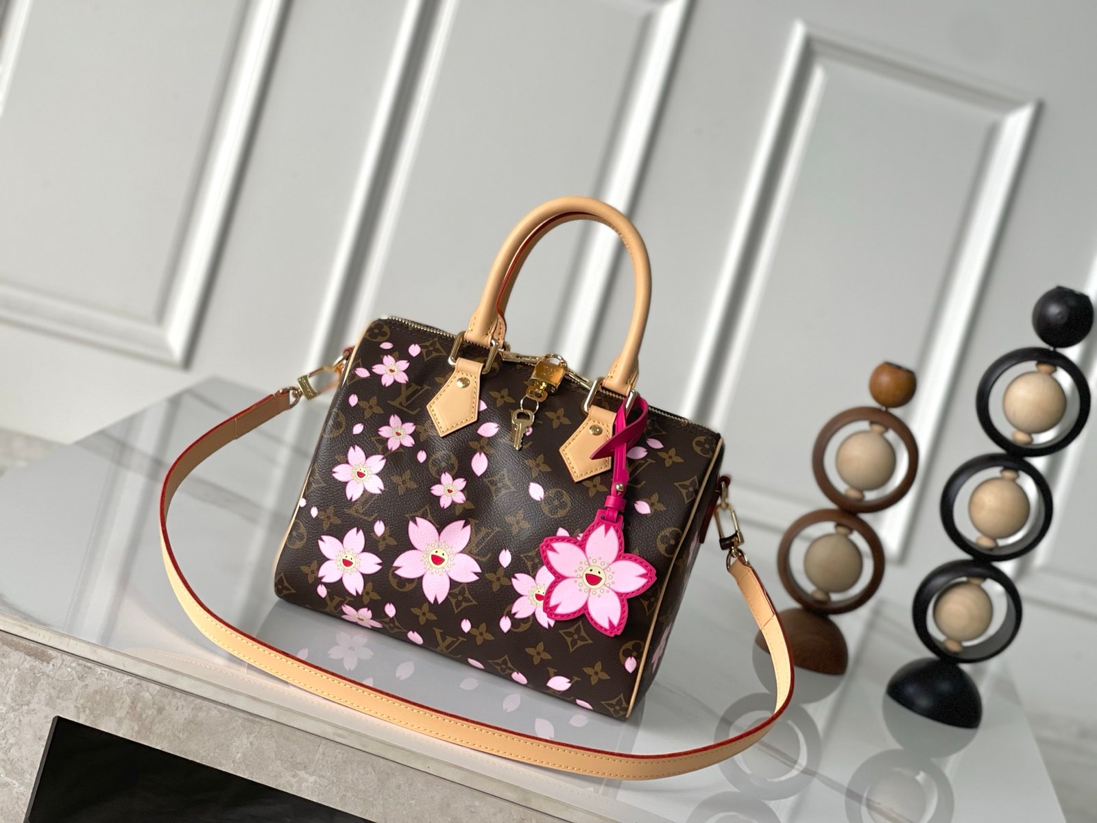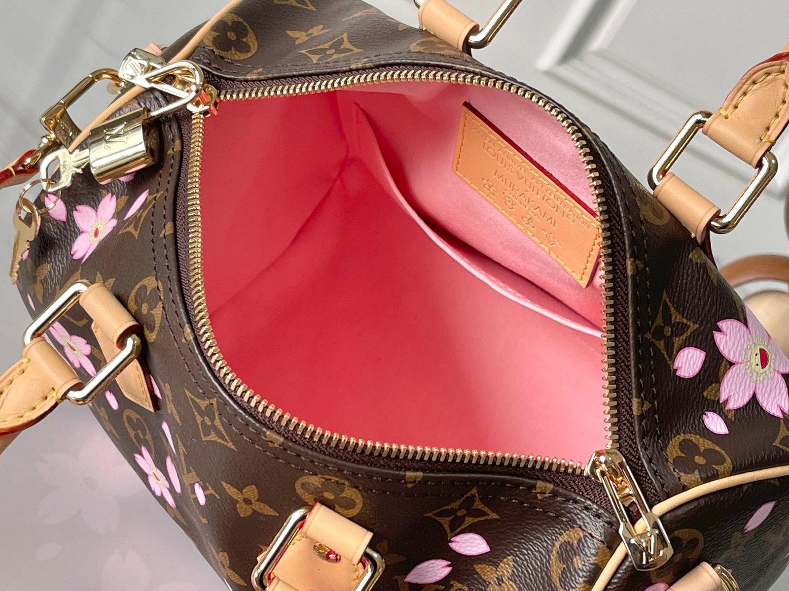 M14174 This Speedy Bandoulière 25 handbag from the Louis Vuitton x Takashi Murakami Re-Editions collection features the brand’s iconic Monogram canvas reimagined with Takashi Murakami’s vibrant Cherry Blossom motif, with the same design elements carried through to the detachable bag charm. The Toron handle and detachable leather shoulder strap are crafted from calf leather, while dual zippers and a padlock ensure your belongings remain secure. 25.0 x 19.0 x 15.0 cm (L x H x W)