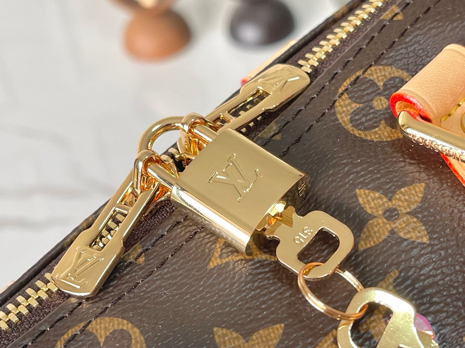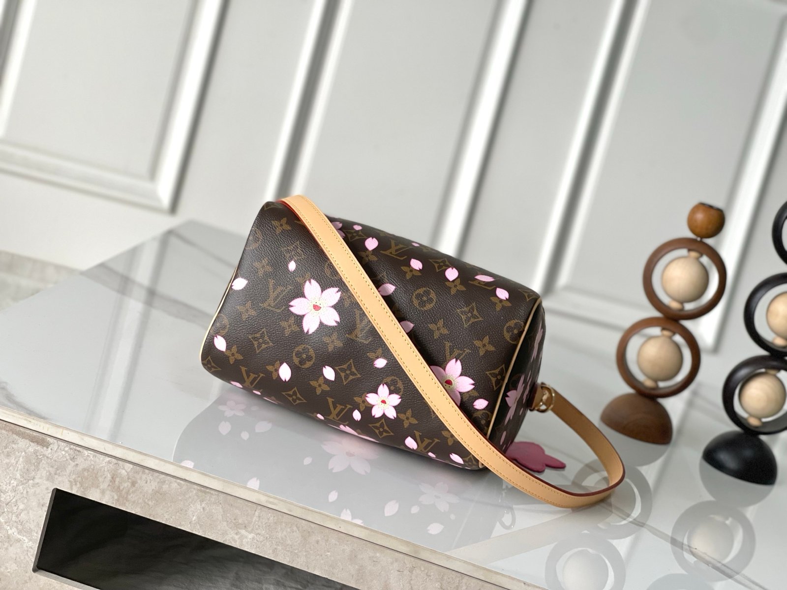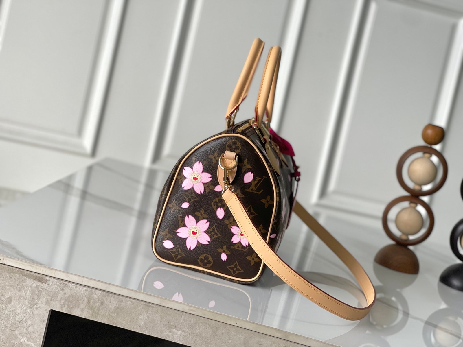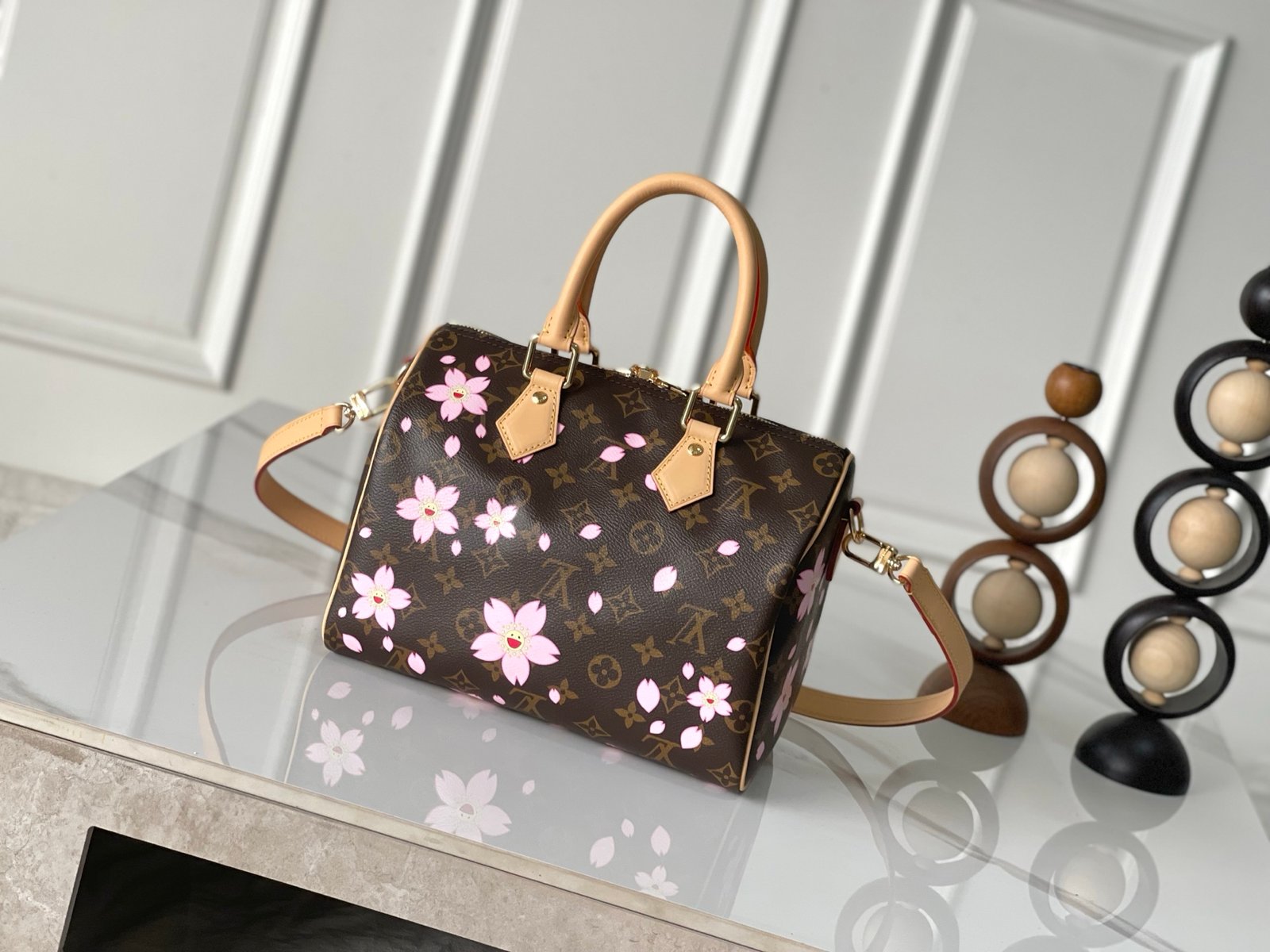 M14174 This Speedy Bandoulière 25 handbag from the Louis Vuitton x Takashi Murakami Re-Editions collection features the brand’s iconic Monogram canvas reimagined with Takashi Murakami’s vibrant Cherry Blossom motif, with the same design elements carried through to the detachable bag charm. The Toron handle and detachable leather shoulder strap are crafted from calf leather, while dual zippers and a padlock ensure your belongings remain secure. 25.0 x 19.0 x 15.0 cm (L x H x W)