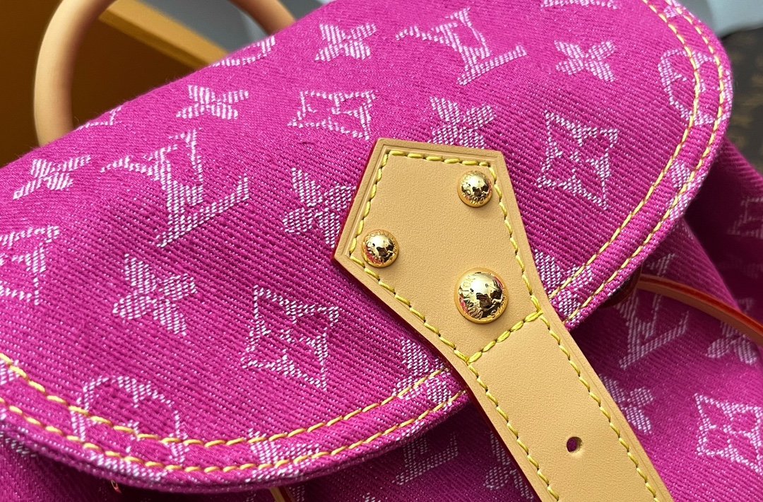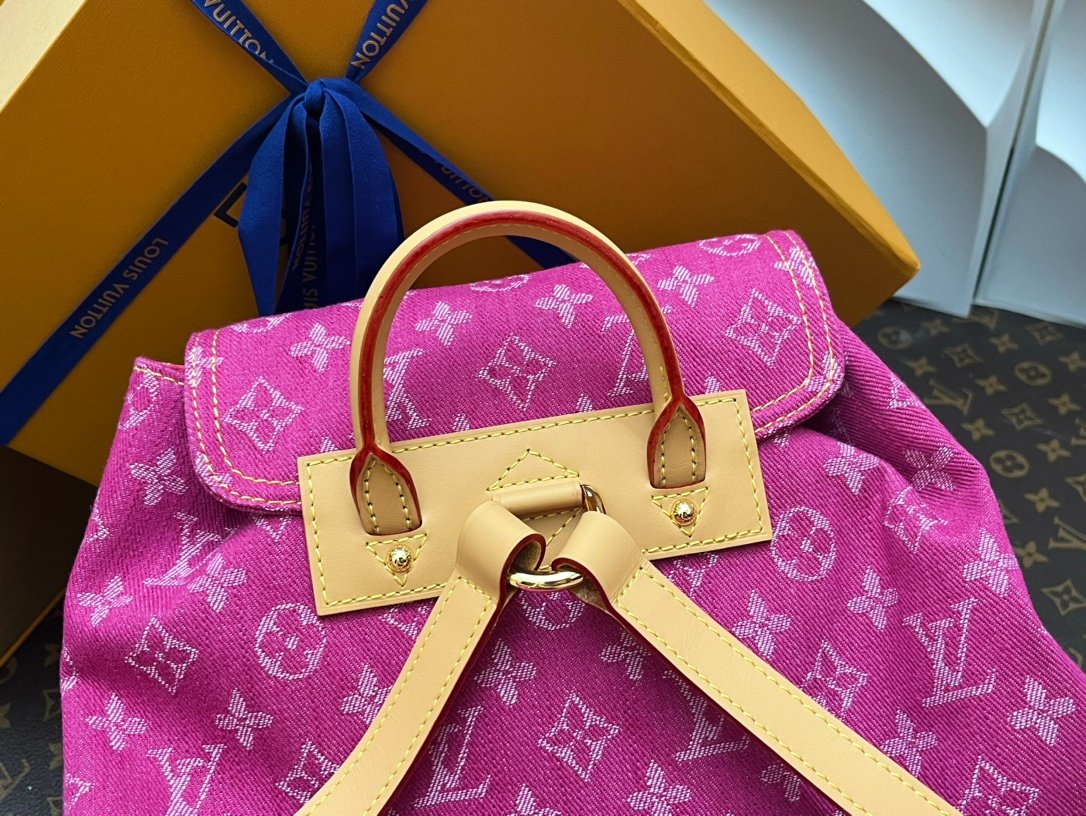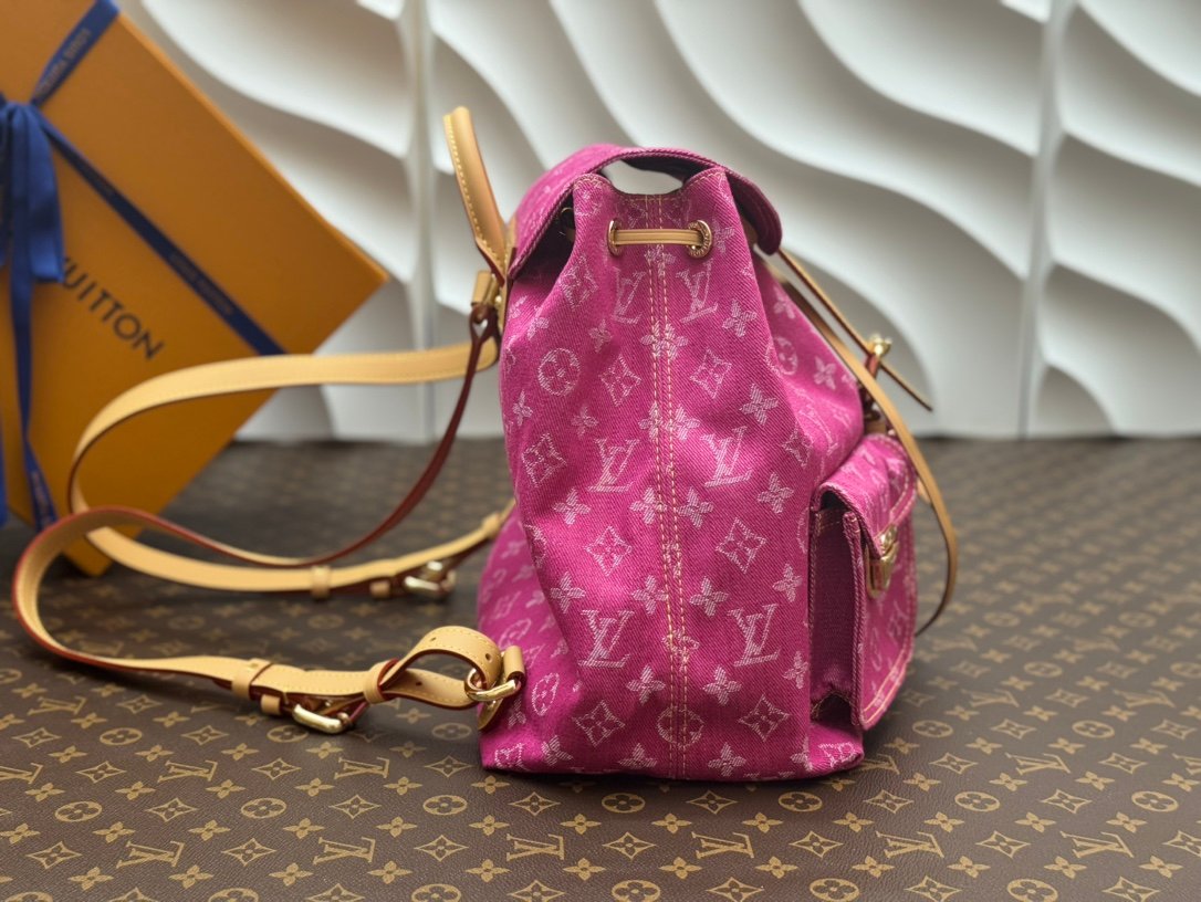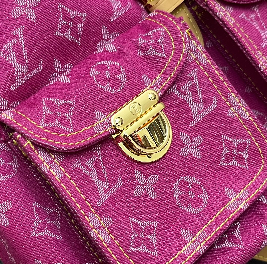 M95240 Rose Pink Denim Backpack | LV Vintage Backpack | Vintage, Discontinued, Limited Edition | Crafted from denim canvas | Soft suede lining | Front flap closure with snap button | Internal compartments | Can be carried by hand or worn over the shoulder | Convenient and practical | Perfect for carrying all your essentials | Suits any style. Dimensions: 28.5 × 20 × 27.5 cm.