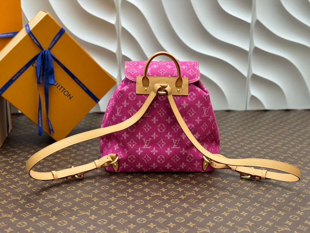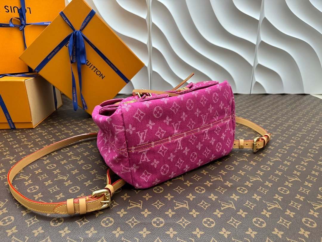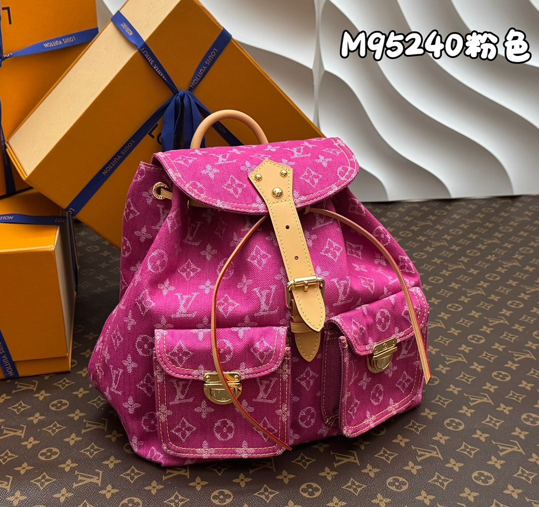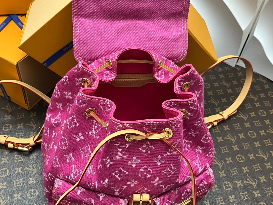M95240 Rose Pink Denim Backpack | LV Vintage Backpack | Vintage, Discontinued, Limited Edition | Crafted from denim canvas | Soft suede lining | Front flap closure with snap button | Internal compartments | Can be carried by hand or worn over the shoulder | Convenient and practical | Perfect for carrying all your essentials | Suits any style. Dimensions: 28.5 × 20 × 27.5 cm.